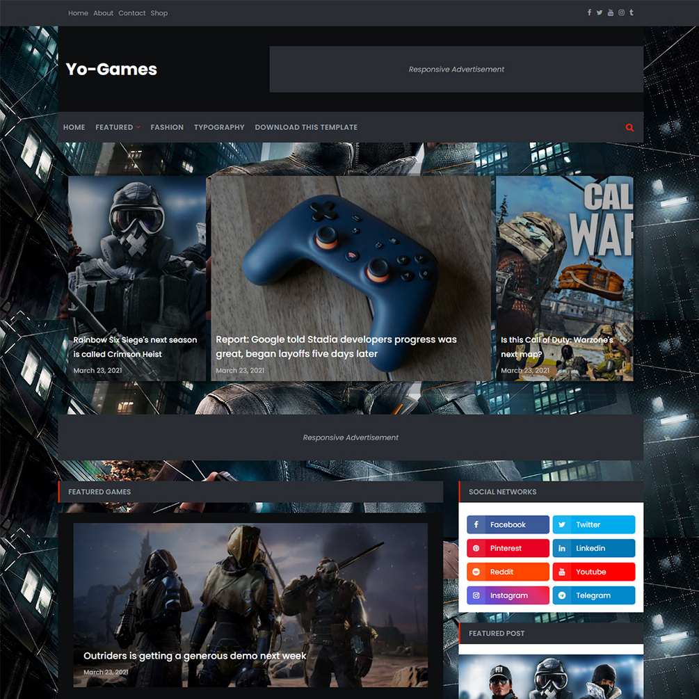 Yo-Games is a premium News / Magazines and Games blogger template. Yo-Games is fully loaded with amazing features and stylish elements. Yo-Games theme is fully responsive and supports all modern web browsers or all devices. We create premium modern look stunning and unique website. so it's works faster and higher performance. Yo-Games theme working on tablets and mobile devices due to its responsive design and retina graphics.